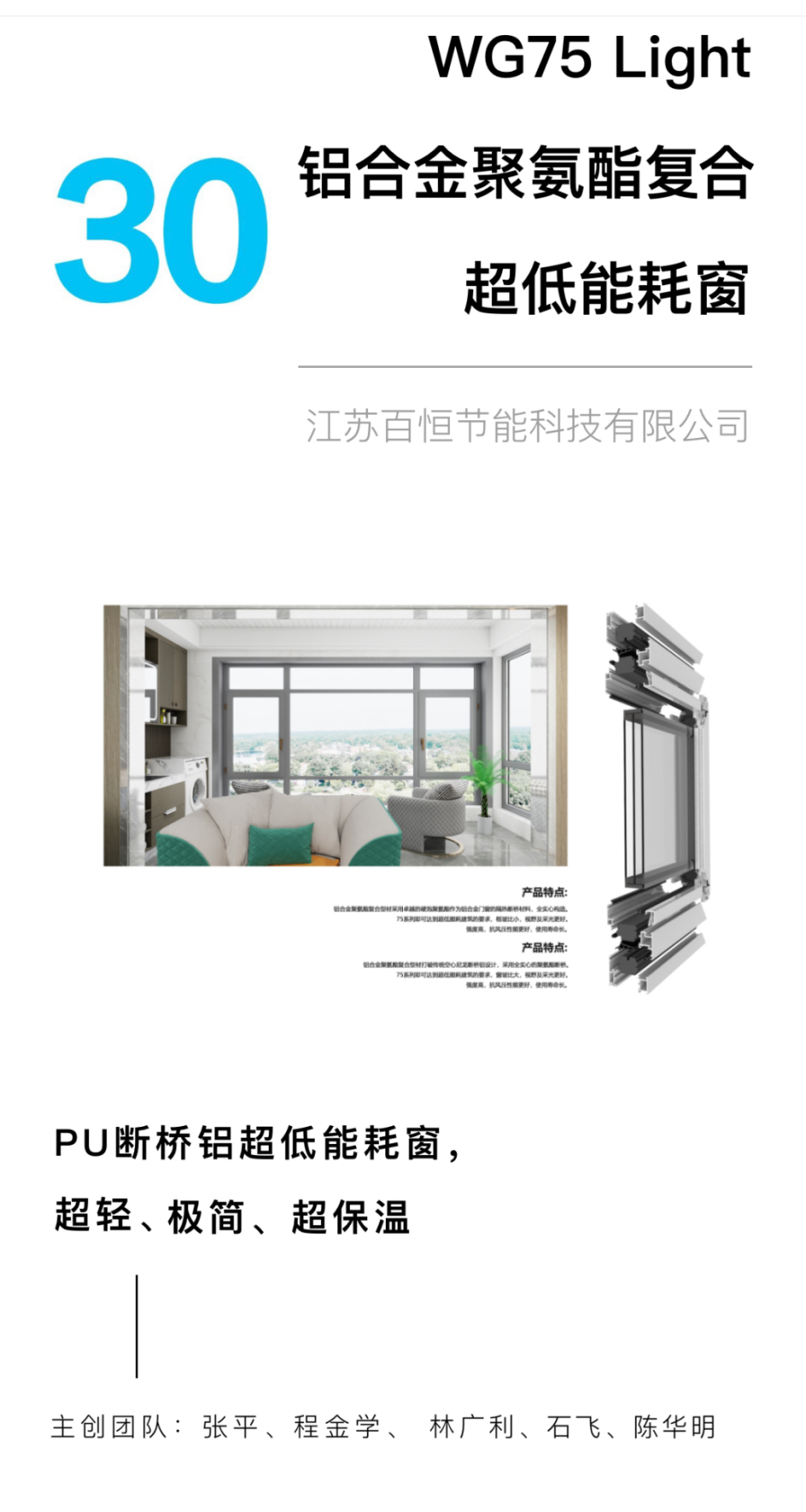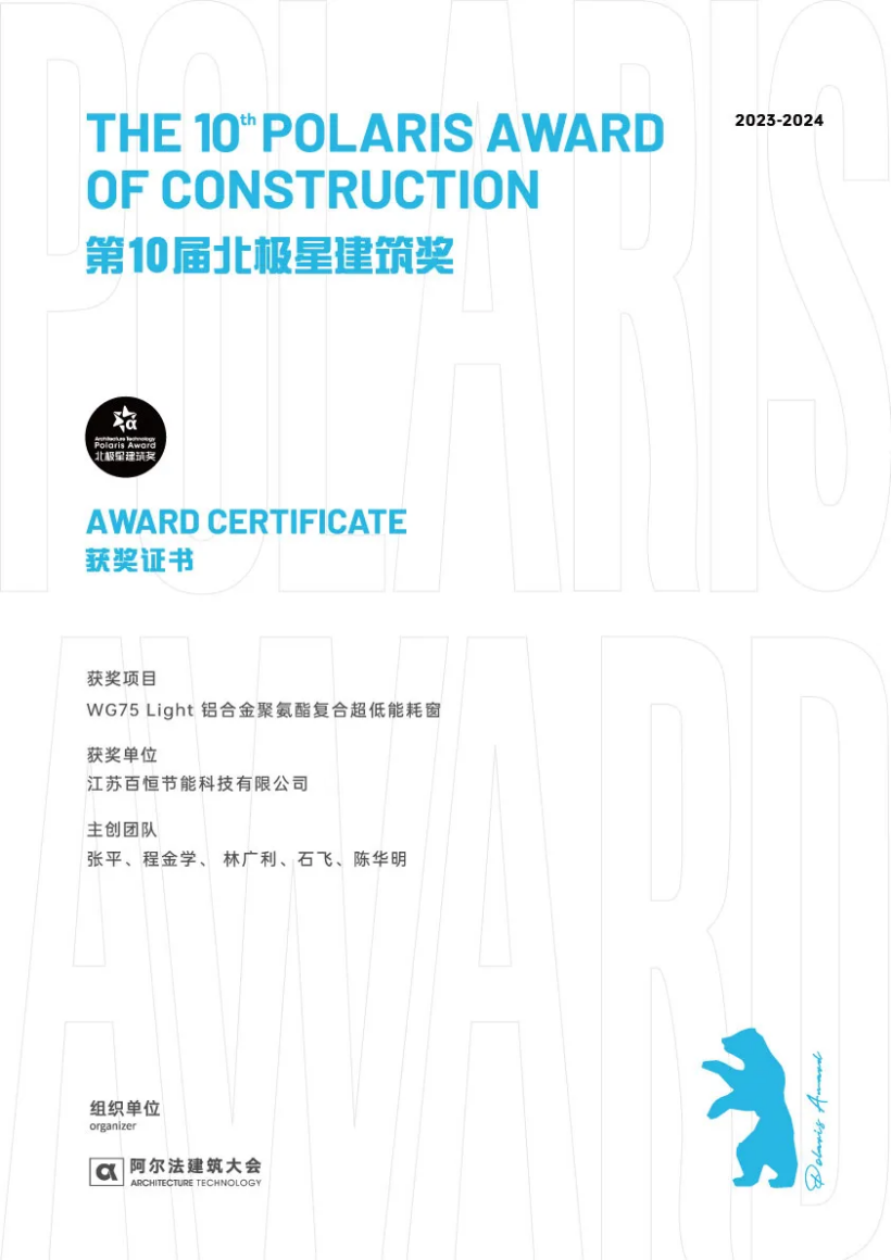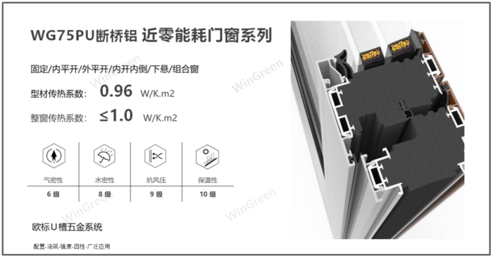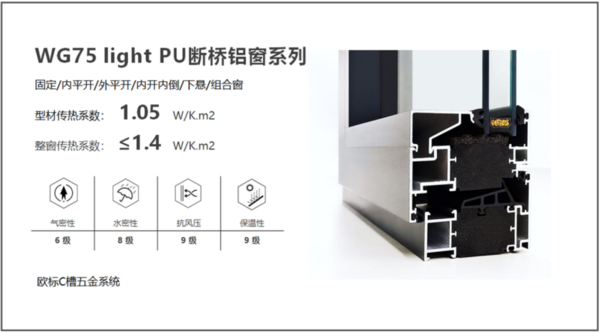 温格润节能有限公司所研发的WG75 Light 铝合金聚氨酯复合超低能耗窗 ,以该产品创新研发的“硬泡聚氨酯”作为铝合金隔热断桥材料,全实心浇注一体化成型,保温性能超强,节能环保等创新亮点,荣获第十届北极星建筑奖。